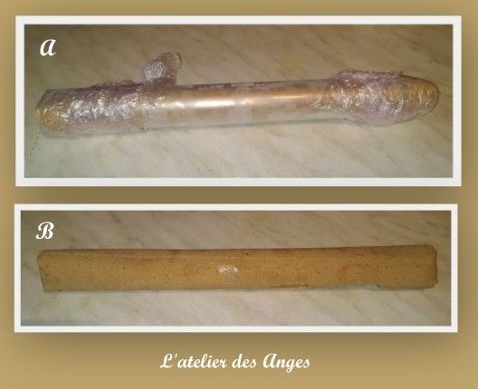 Laisser refroidir, puis turbiner 30 minutes. Pendant ce temps, préparer avec une feuille de papier de guitare, un tube de 3 à 3,5 cm de diamètre sur 32 cm de long. Obstruer un bout du tube, et couler dedans la glace praliné. Tapoter légèrement le tube à la verticale, pour bien répartir la glace à l'intérieur du tube. Fermer le bout du tube et le placer ensuite au congélateur pendant 12 h (A).