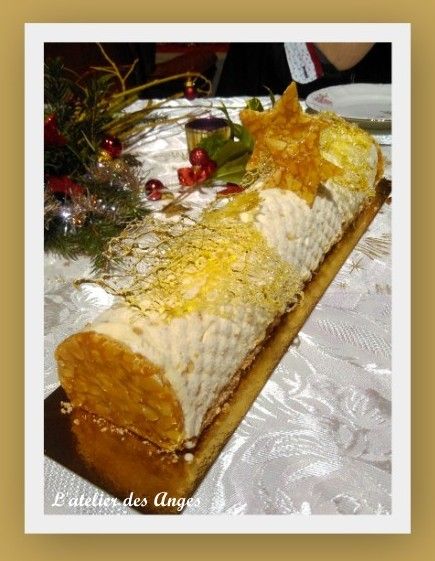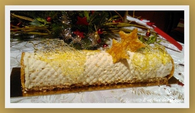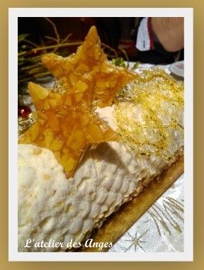 Au moment du dessert, enfin 10 minutes avant de servir, démouler la bûche, retirer le film. Placer les embouts de nougatine et les décors. Pour moi, deux étoiles en nougatine et quelques morceaux de dentelle de caramel.